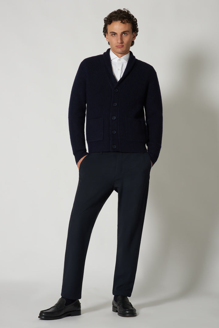 Navy Pure Cashmere Shawl Collar English Rib Cardigan